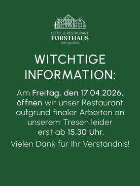 Am kommenden Freitag, den 17.04.2026, startet unser Restaurantbetrieb ausnahmsweise erst um 15:30 Uhr.